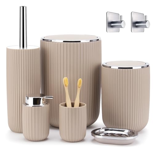 - Includes 6 essential bathroom accessories: soap dish, toothbrush holder, rinse cup, lotion bottle, trash can, and toilet brush.