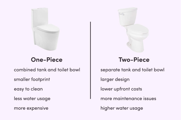 Think about space, cleaning, and cost before choosing a toilet. One-piece toilets are easier to clean because they have fewer crevices. Two-piece toilets separate the tank and bowl, which can be easier to fix if parts break.