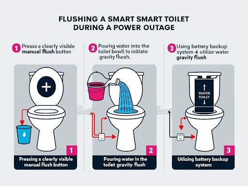 Smart toilets need electricity to work. If the power goes out, the automatic flush may stop working. Manual flushing lets you use the toilet normally.