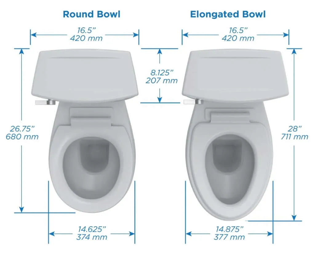 Toilets have round or elongated bowls. Round bowls are shorter and more circular. Elongated bowls are longer and oval-shaped.