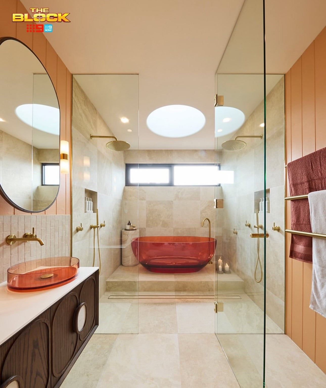 Sculptural decor adds shape and texture to a bathroom. It can be made from stone, glass, or metal.