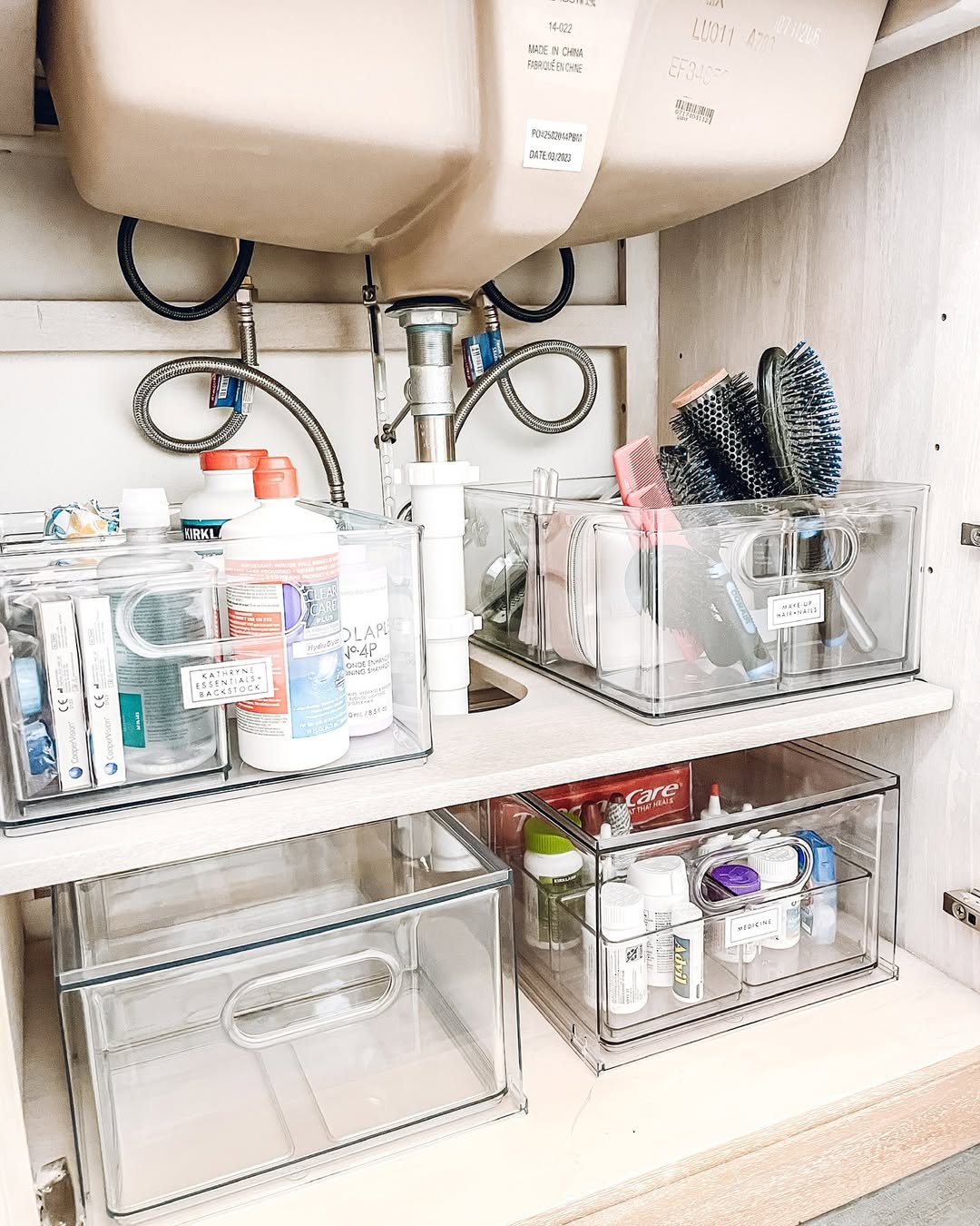 Clear containers make it easy to see what you have. Keep daily use items in front and less used supplies in the back.